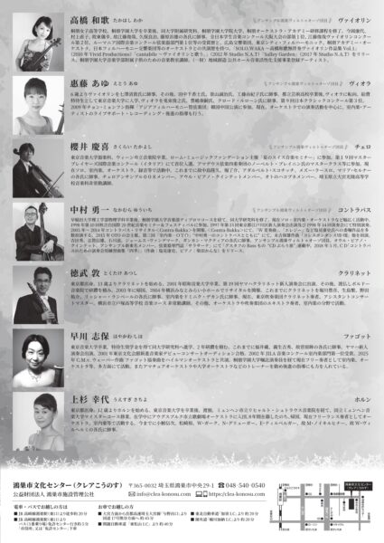 ≪出演者≫ ヴァイオリン/※髙橋和歌 ヴィオラ/※惠藤あゆ チェロ・企画構成/※櫻井慶喜 コントラバス/※中村勇一 ※アンサンブル鴻巣ヴィルトゥオーゾ団員 クラリネット/徳武敦 ファゴット/早川志保 ホルン/上杉幸代 ※都合により出演者、曲目等を変更させていただく場合がございます。 |
