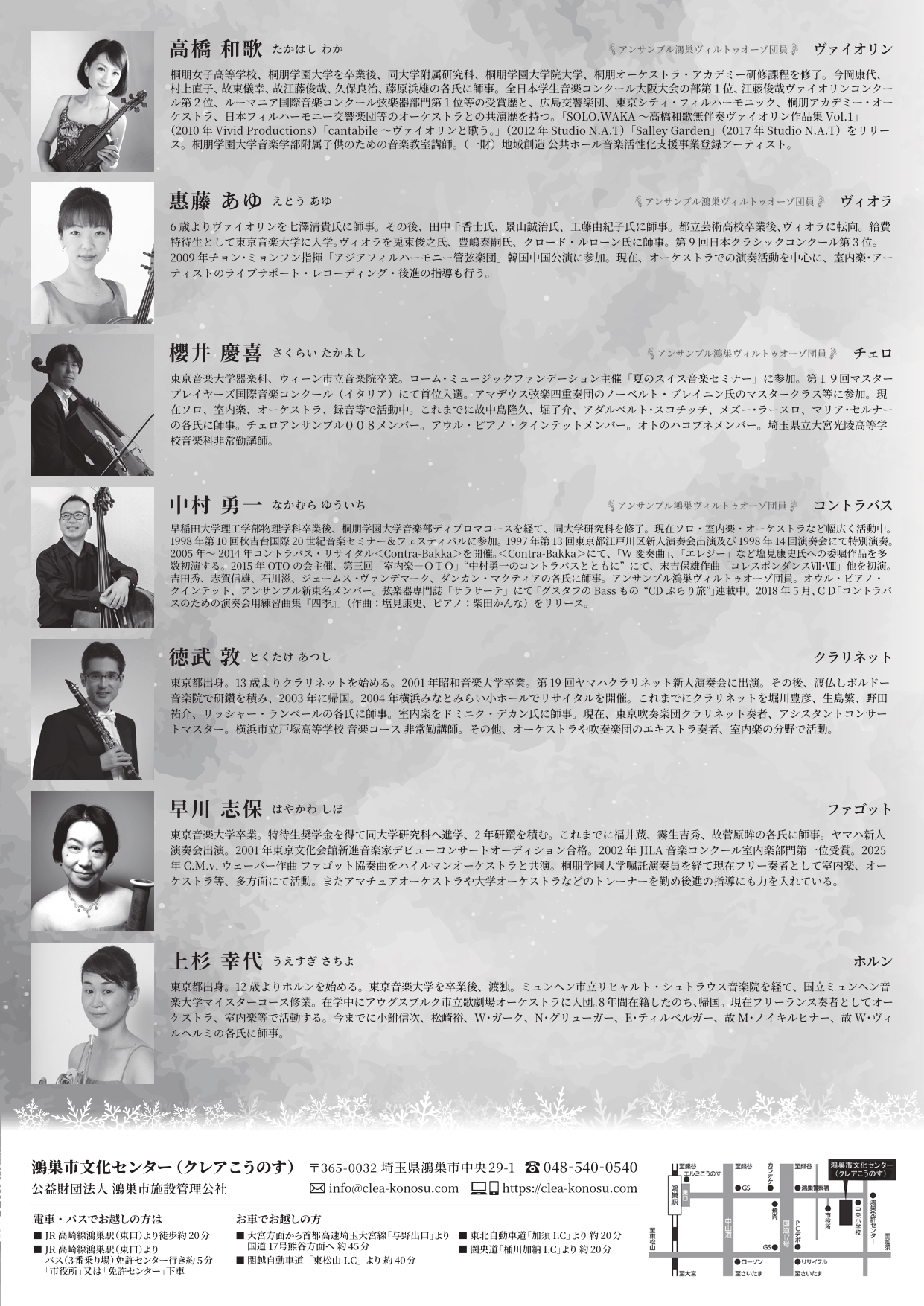 ≪出演者≫ ヴァイオリン/※髙橋和歌 ヴィオラ/※惠藤あゆ チェロ・企画構成/※櫻井慶喜 コントラバス/※中村勇一 ※アンサンブル鴻巣ヴィルトゥオーゾ団員 クラリネット/徳武敦 ファゴット/早川志保 ホルン/上杉幸代 ※都合により出演者、曲目等を変更させていただく場合がございます。 |