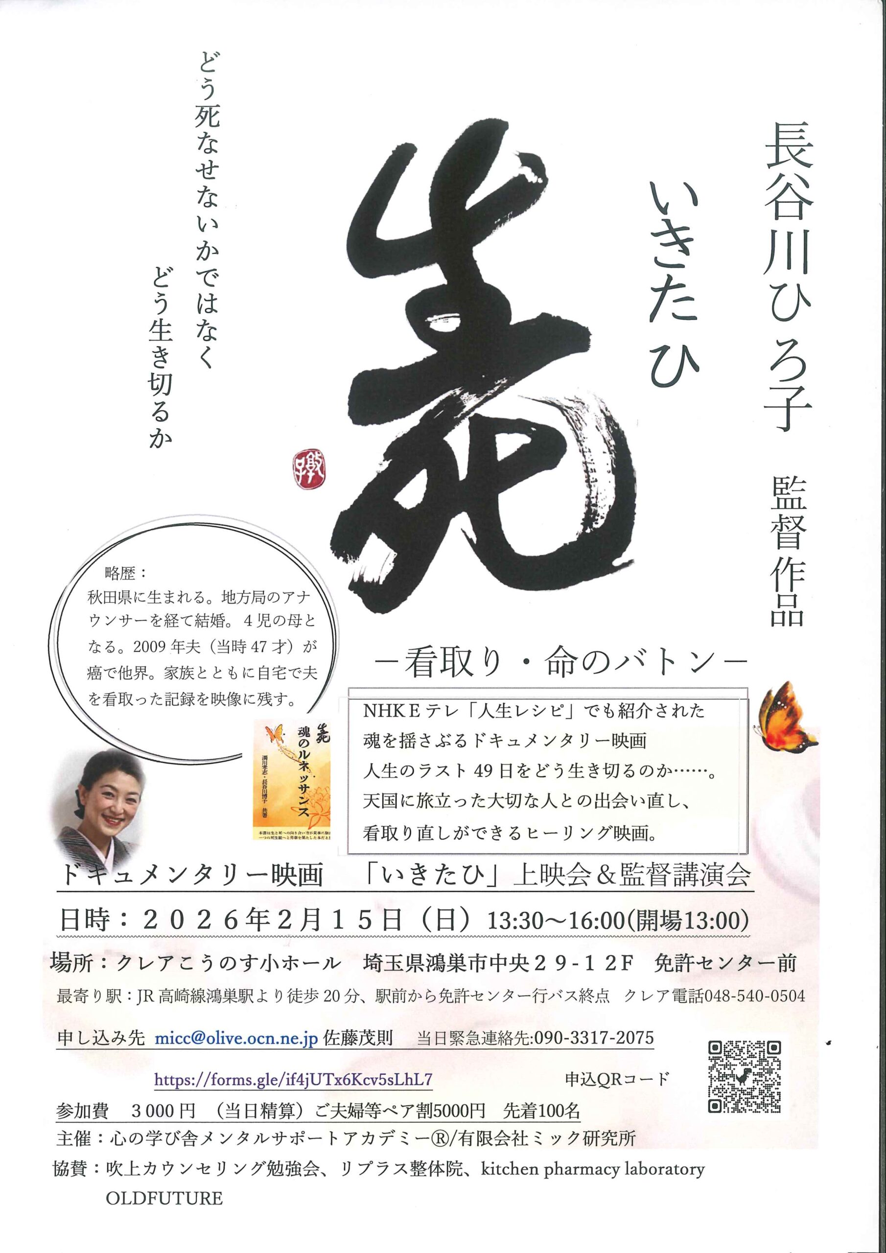 日 | ドキュメンタリー映画「いきたひ」上映会&監督講演会 | 13:30 | 有料 | 心の学び舎メンタルサポートアカデミー/(有)ミック研究所 |